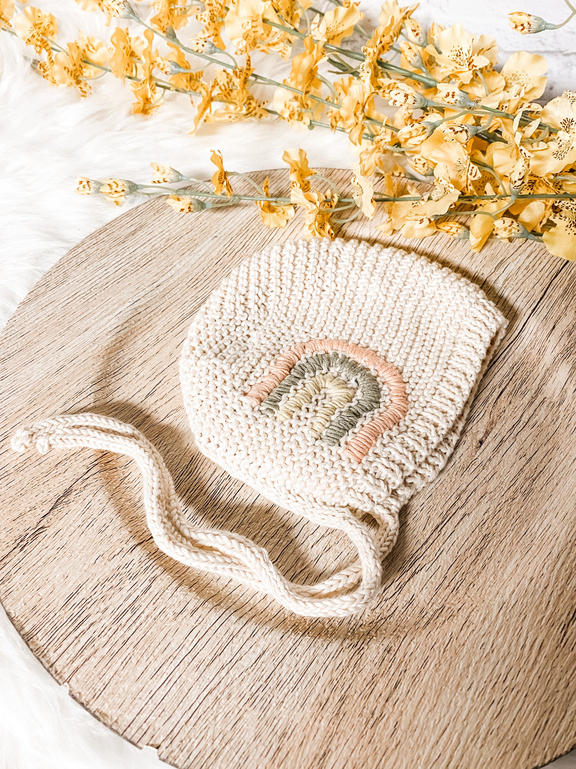 This baby girl bonnet with embroidered rainbow was hand-knit using the softest organic cotton for your little one's head.