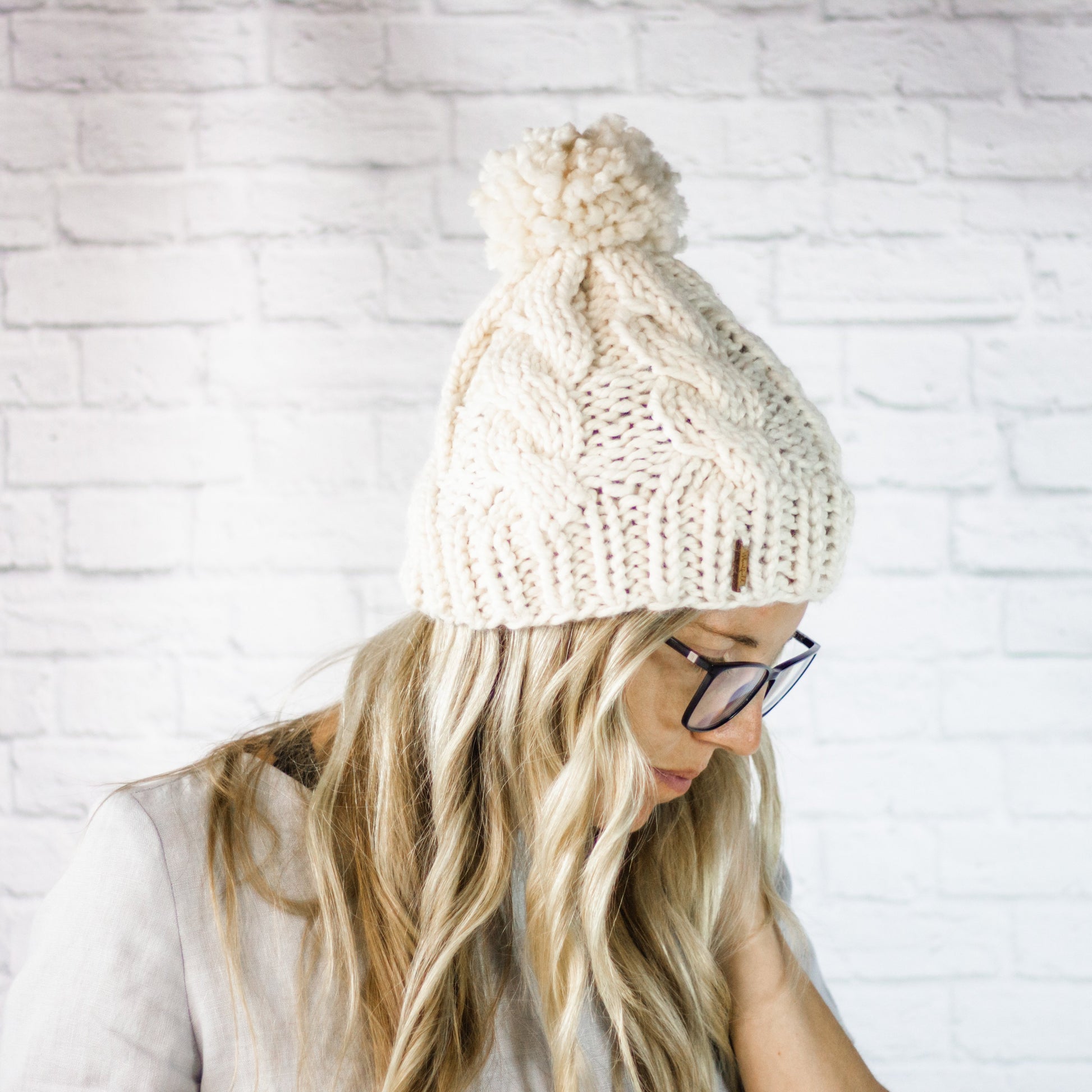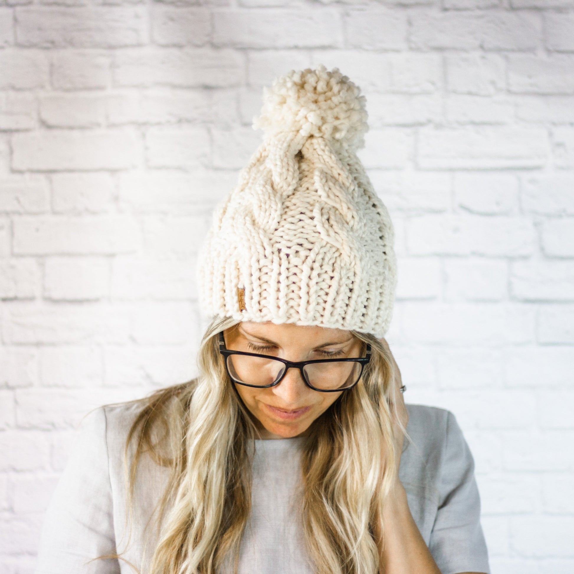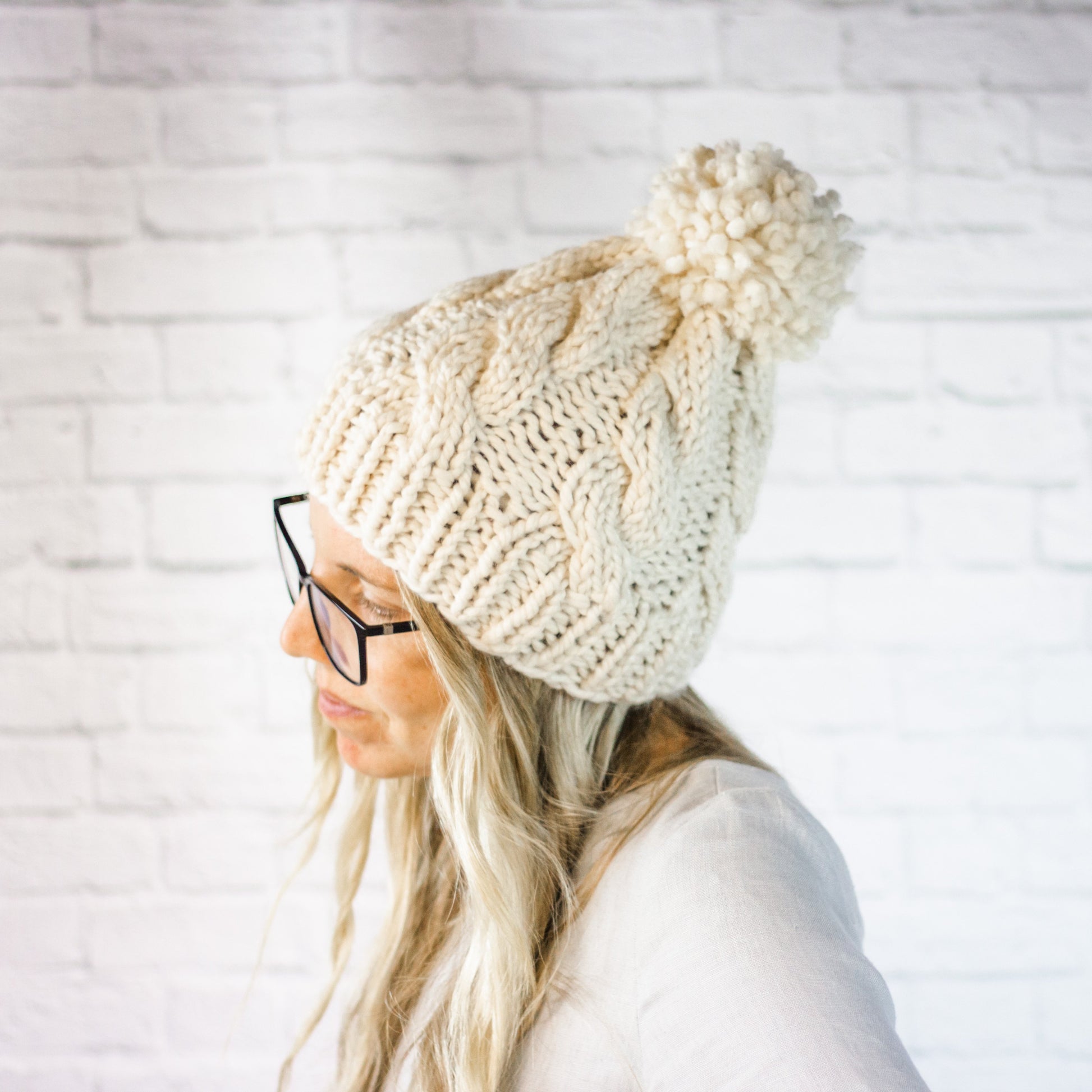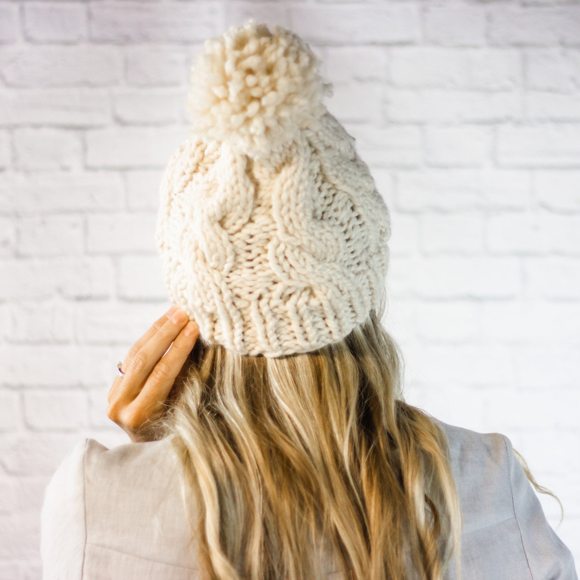 Cream Chunky Cable Knit Cabled Pom Pom Beanie Hat for Women